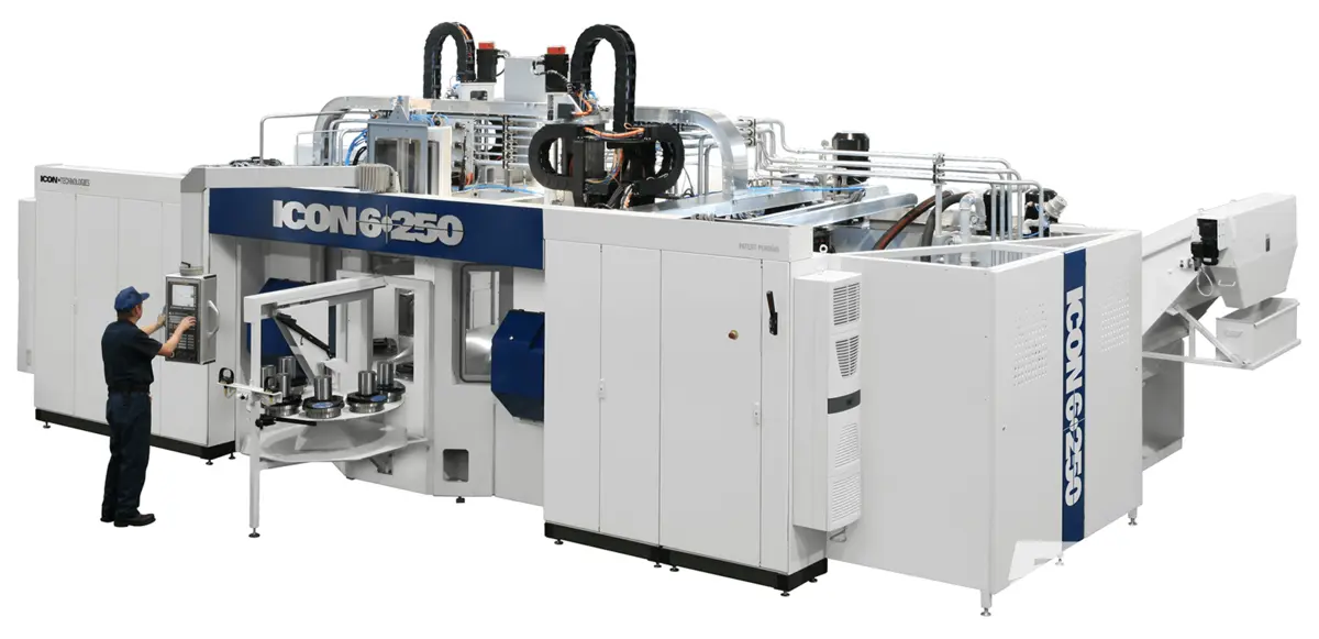 The ICON part sizes range from a 2" cube to an 8" cube and can put up to eight tools in the cut at once with up to 8 machining units, four horizontal and four vertical units, each with a 10-tool changer fully equipped for your specific applications. Four cutting stations, each with integrated pallet changers produce 5 sided machining with 4 axis interpolation.