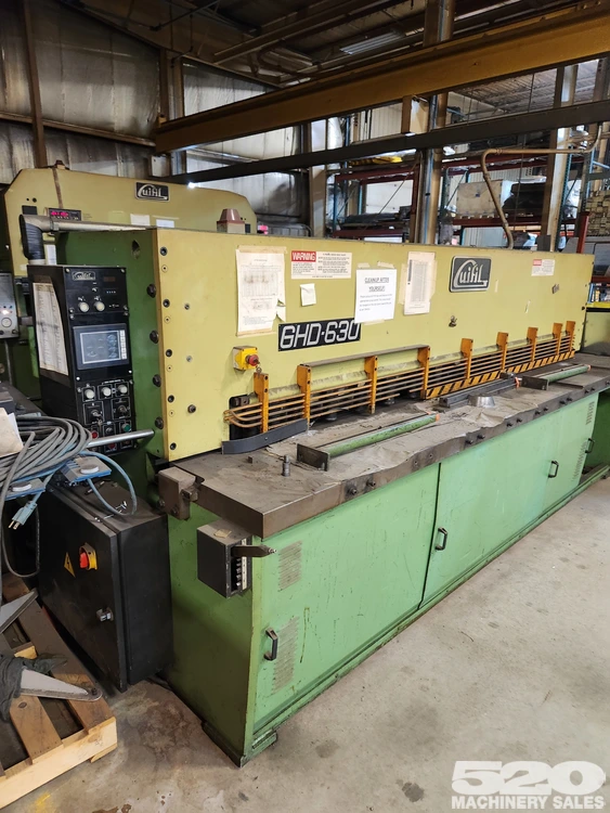 For sale: GUIFIL GHD-630 Power Squaring Shear, 1987 used condition with 122' blade, hydraulics, and 12 hp motor. Includes digital back-gauge, cutting controls, and updated PLC. Robust and ready for operation.