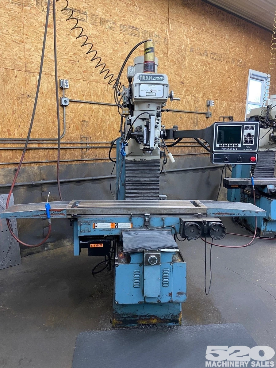 2000 TRAK DPM 5 Bed Mill, used. SWI make, 12"x50" table, 3-axis, 40" long travel, 20" cross travel, 5 hp, 4000 RPM, 40 taper. Includes TRAK SMX Control, Power Draw Bar, work light, more.