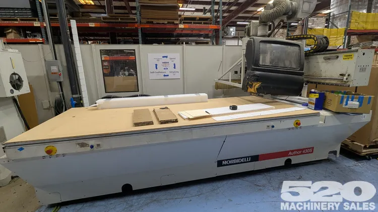 2003 Morbidelli Author 430S CNC Router available, featuring a 120"x51" table, 12 hp power, and 18,000 RPM. Equipped with HSK F63 taper and 3-axis capability, ideal for precise and efficient machining. Condition: Used.