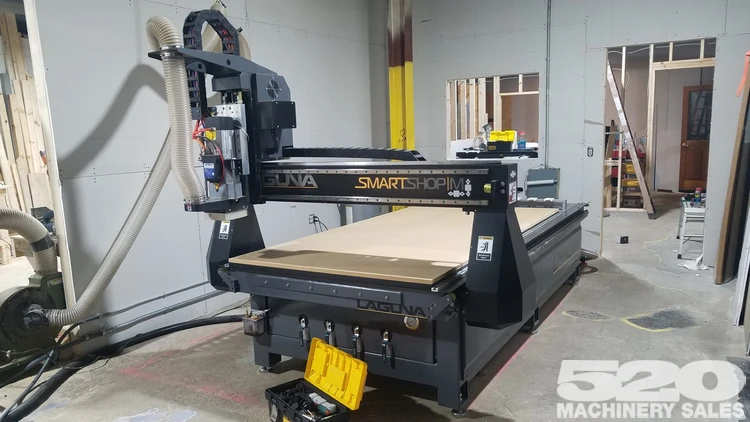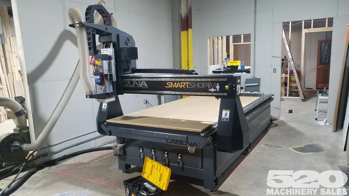 2022 Laguna Smartshop M CNC Router. Machine is in very good condition and can be viewed under power as needed. Machine has under 1000 hours on it as of 11/18/25. Includes: 8 position automatic toolchanger, 4 zone vacuum table, and a dedicated air compressor.