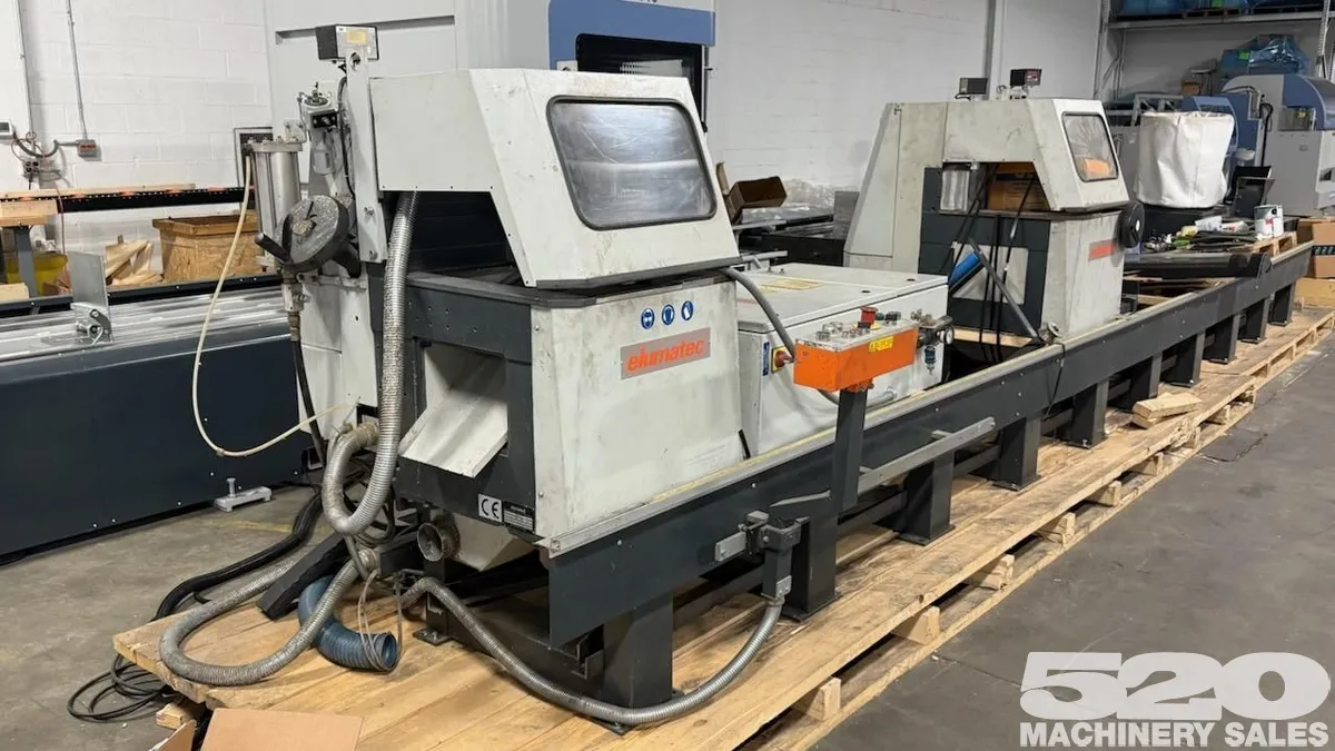 For sale: 2001 Elumatec DG 142/02 Dual Miter Saw. Features a 19-11/16" blade, 14.8 hp power, and electronic positioner. Includes manual length adjustment and PC control. Cutting bed length: 133.8". Efficient and powerful tool for precision work.