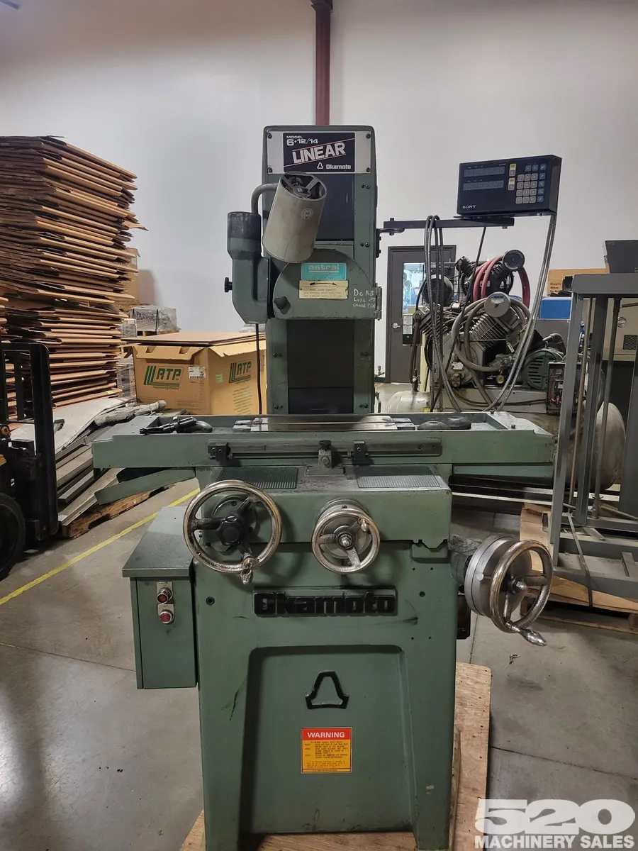 OKAMOTO PFG-612 used reciprocating surface grinder. Features 6"x12" table, 2 hp, 1" grinding wheel width, 8" wheel diameter. Ideal for precision grinding tasks in machine shops.