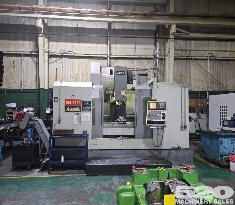 2005 Awea BM-1600 CNC Vertical Machining Center. Machine is in good condition and can be inspected under power as needed. Machine includes sidemount toolchanger, chip conveyor, and CT50 spindle taper.
